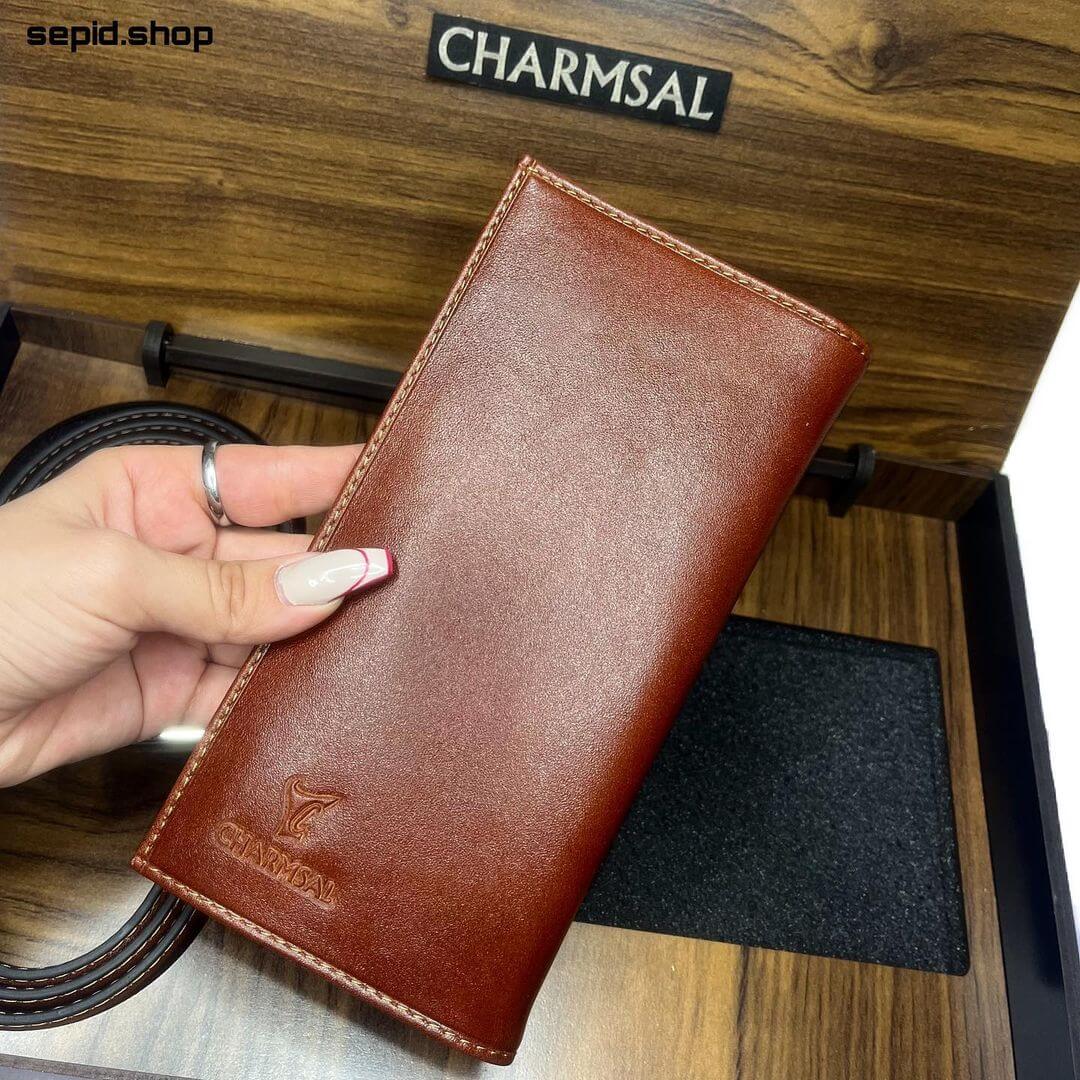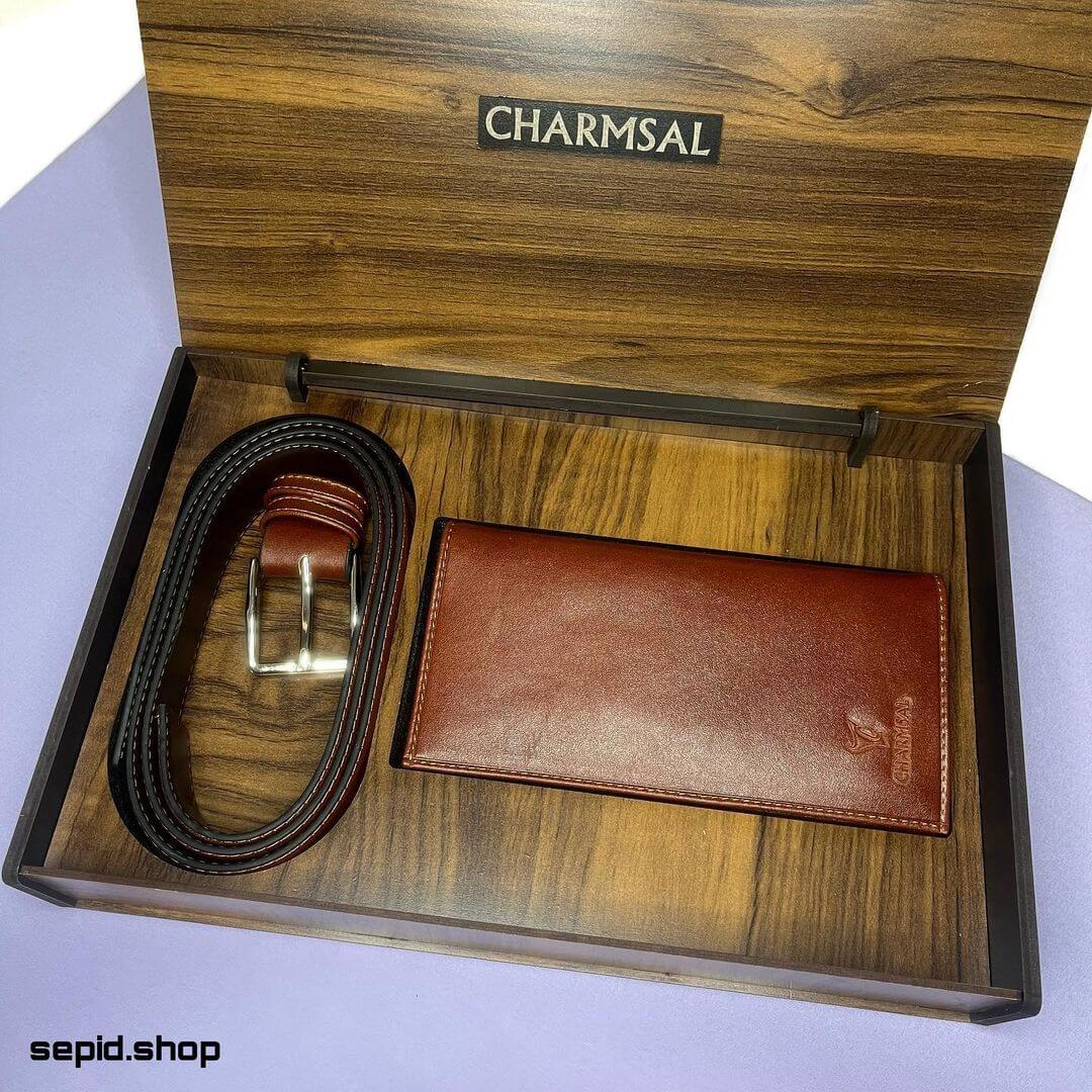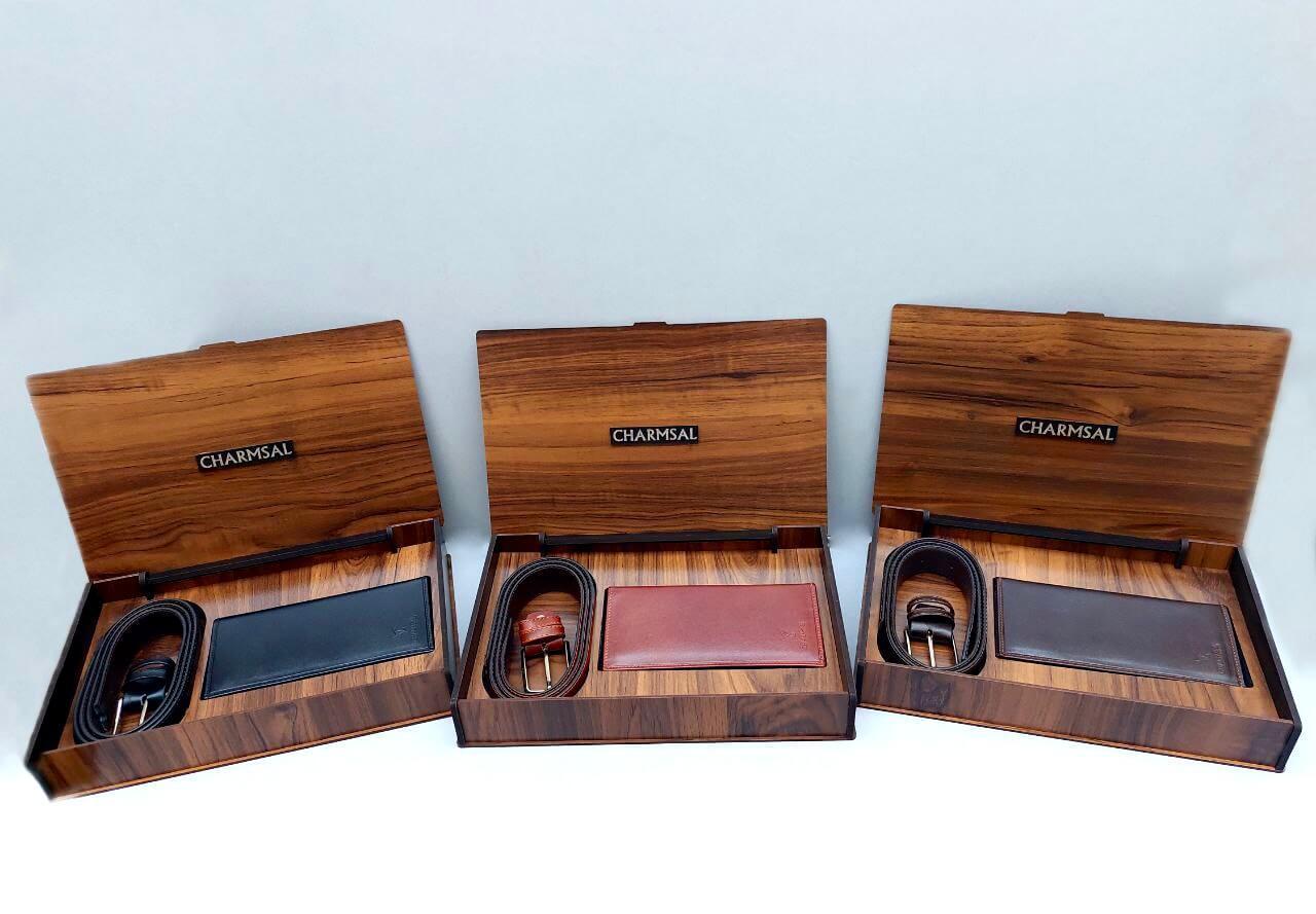 ست شامل 2 تکه: کیف پول بلند و کمربند چرم گاوی به همراه جعبه چوبی تاشو میباشد.